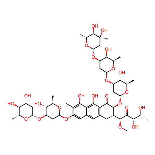 | SMILES | C[C@@H]1[C@H]([C@@H](C[C@@H](O1)O[C@@H]2C[C@@H](O[C@@H]([C@H]2O)C)OC3=CC4=CC5=C(C(=O)[C@H]([C@@H](C5)[C@@H](C(=O)[C@H]([C@@H](C)O)O)OC)O[C@H]6C[C@H]([C@@H]([C@H](O6)C)O)O[C@H]7C[C@H]([C@H]([C@H](O7)C)O)O[C@H]8C[C@]([C@@H]([C@H](O8)C)O)(C)O)C(=C4C(=C3C)O)O)O)O |