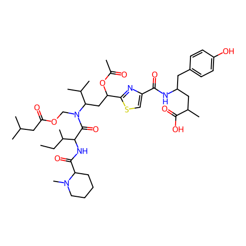| SMILES | CCC(C)C(C(=O)N(COC(=O)CC(C)C)C(CC(C1=NC(=CS1)C(=O)NC(CC2=CC=C(C=C2)O)CC(C)C(=O)O)OC(=O)C)C(C)C)NC(=O)C3CCCCN3C |