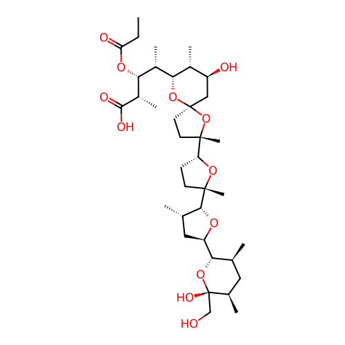 | 2 | CCC(=O)O[C@H]([C@H](C)[C@H]1O[C@@]2(CC[C@@](C)([C@H]3CC[C@@](C)([C@@H]4O[C@@H]([C@H]5O[C@@](O)(CO)[C@H](C)C[C@@H]5C)C[C@@H]4C)O3)O2)C[C@H](O)[C@H]1C)[C@H](C)C(=O)O | Lee W; Kang S; Jung B; Lee HS; Kang SH Total synthesis of laidlomycin. Chemical Communications 2016 52 (17) 3536-3539. DOI: 10.1039/c5cc10673g PMID: 26842424 | ||