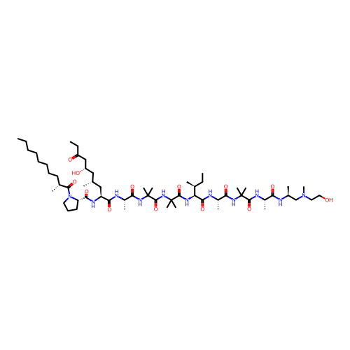 | SMILES | CCCCCCCC[C@@H](C)C(=O)N1CCC[C@H]1C(=O)N[C@@H](C[C@H](C)C[C@@H](CC(=O)CC)O)C(=O)N[C@@H](C)C(=O)NC(C)(C)C(=O)NC(C)(C)C(=O)N[C@@H]([C@@H](C)CC)C(=O)N[C@@H](C)C(=O)NC(C)(C)C(=O)N[C@@H](C)C(=O)N[C@@H](C)CN(C)CCO |