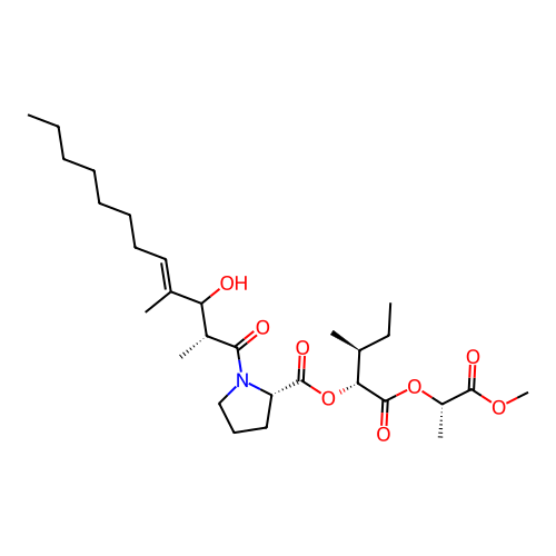 | SMILES | CCCCCCC/C=C(\C)/C([C@@H](C)C(=O)N1CCC[C@H]1C(=O)O[C@H]([C@@H](C)CC)C(=O)O[C@@H](C)C(=O)OC)O |