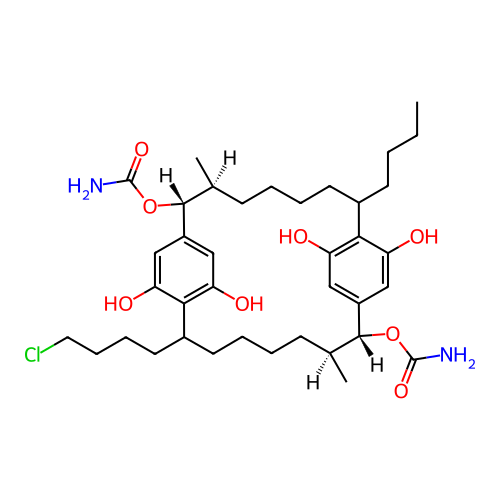 | SMILES | CCCCC1CCCC[C@@H]([C@H](C2=CC(=C(C(CCCC[C@@H]([C@H](C3=CC(=C1C(=C3)O)O)OC(=O)N)C)CCCCCl)C(=C2)O)O)OC(=O)N)C |