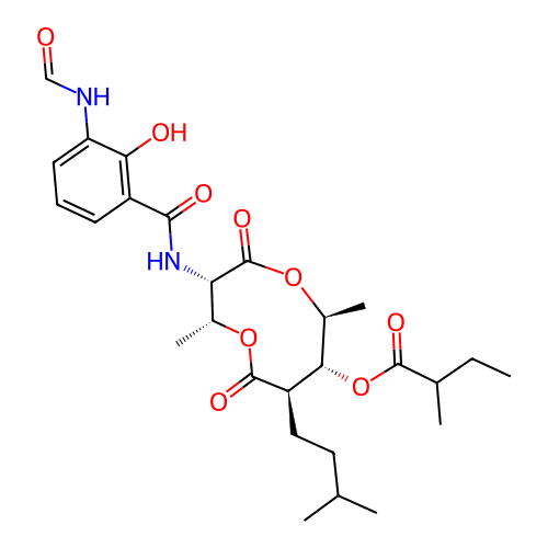 | SMILES | CCC(C)C(=O)O[C@H]1[C@@H](OC(=O)[C@H]([C@H](OC(=O)[C@@H]1CCC(C)C)C)NC(=O)C2=C(C(=CC=C2)NC=O)O)C |