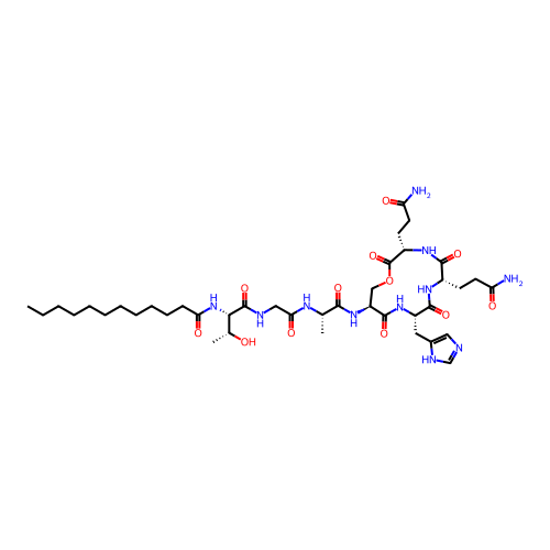 | SMILES | CCCCCCCCCCCC(=O)N[C@@H]([C@@H](C)O)C(=O)NCC(=O)N[C@@H](C)C(=O)N[C@H]1COC(=O)[C@@H](NC(=O)[C@@H](NC(=O)[C@@H](NC1=O)CC2=CN=CN2)CCC(=O)N)CCC(=O)N |