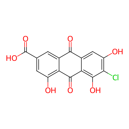 | CCMSLIB00004701470 | Bronze | 6-chloro-4,5,7-trihydroxy-9,10-dioxoanthracene-2-carboxylic&acid |