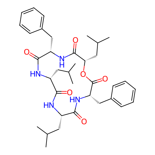| SMILES | CC(C)C[C@@H]1C(=O)N[C@H](C(=O)N[C@H](C(=O)O[C@H](C(=O)N[C@H](C(=O)N1)CC2=CC=CC=C2)CC(C)C)CC3=CC=CC=C3)CC(C)C |