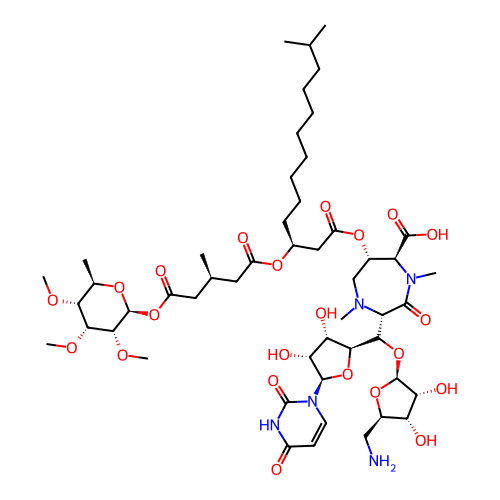 | SMILES | C[C@@H]1[C@H]([C@H]([C@H]([C@@H](O1)OC(=O)C[C@@H](C)CC(=O)O[C@@H](CCCCCCCCC(C)C)CC(=O)O[C@H]2CN([C@H](C(=O)N([C@@H]2C(=O)O)C)C([C@@H]3[C@H]([C@H]([C@@H](O3)N4C=CC(=O)NC4=O)O)O)O[C@H]5[C@@H]([C@@H]([C@H](O5)CN)O)O)C)OC)OC)OC |