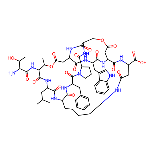 | SMILES | CC1C(C(=O)NC(C(=O)NC2CCCCNC(=O)CC(NC(=O)C3CC(=O)OCC(C(=O)NC(CC(=O)O1)C(=O)NC(C(=O)N3)CC4=CNC5=CC=CC=C54)NC(=O)C6CCCN6C(=O)C(NC2=O)CC7=CC=CC=C7)C(=O)O)CC(C)C)NC(=O)C(C(C)O)N |