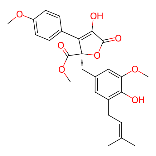 | InChI | InChI=1S/C26H28O8/c1-15(2)6-7-18-12-16(13-20(32-4)22(18)27)14-26(25(30)33-5)21(23(28)24(29)34-26)17-8-10-19(31-3)11-9-17/h6,8-13,27-28H,7,14H2,1-5H3/t26-/m1/s1 |