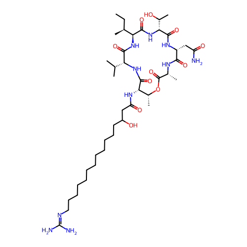 | SMILES | CC[C@H](C)[C@H]1C(=O)N[C@@H](C(=O)N[C@@H](C(=O)N[C@@H](C(=O)O[C@@H]([C@@H](C(=O)N[C@@H](C(=O)N1)C(C)C)NC(=O)CC(CCCCCCCCCCCCN=C(N)N)O)C)C)CC(=O)N)C(C)O |