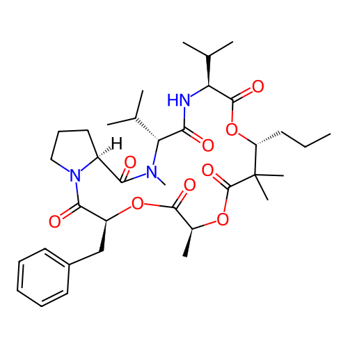 | SMILES | CCC[C@@H]1C(C(=O)O[C@H](C(=O)O[C@H](C(=O)N2CCC[C@H]2C(=O)N([C@@H](C(=O)N[C@H](C(=O)O1)C(C)C)C(C)C)C)CC3=CC=CC=C3)C)(C)C |