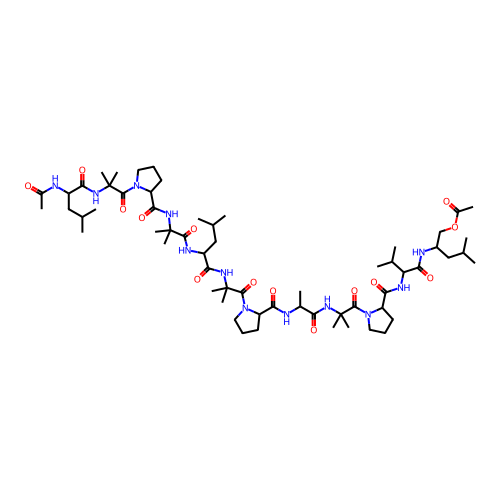 | SMILES | CC(C)CC(COC(=O)C)NC(=O)C(C(C)C)NC(=O)C1CCCN1C(=O)C(C)(C)NC(=O)C(C)NC(=O)C2CCCN2C(=O)C(C)(C)NC(=O)C(CC(C)C)NC(=O)C(C)(C)NC(=O)C3CCCN3C(=O)C(C)(C)NC(=O)C(CC(C)C)NC(=O)C |