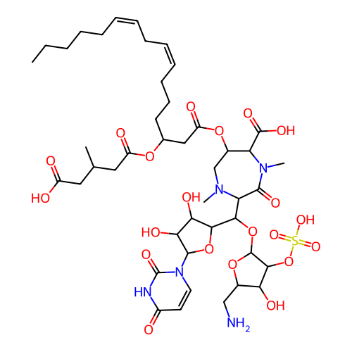 | SMILES | CCCCC/C=C\C/C=C\CCCC(CC(=O)OC1CN(C(C(=O)N(C1C(=O)O)C)C(C2C(C(C(O2)N3C=CC(=O)NC3=O)O)O)OC4C(C(C(O4)CN)O)OS(=O)(=O)O)C)OC(=O)CC(C)CC(=O)O |