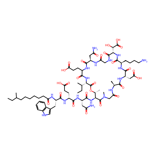 | SMILES | CCC(C)CCCCCCC(=O)N[C@@H](CC1=CNC2=C1C=CC=C2)C(=O)N[C@H](CCC(O)=O)C(=O)N[C@@H](CC(N)=O)C(=O)N[C@H]1[C@@H](C)OC(=O)[C@@H](NC(=O)C(CCC(O)=O)NC(=O)[C@@H](CC(N)=O)NC(=O)CNC(=O)[C@@H](NC(=O)[C@@H](CCCCN)NC(=O)[C@H](CC(O)=O)NC(=O)[C@H](C)NC(=O)CN(C)C1=O)C(O)C(O)=O)C(C)CC |