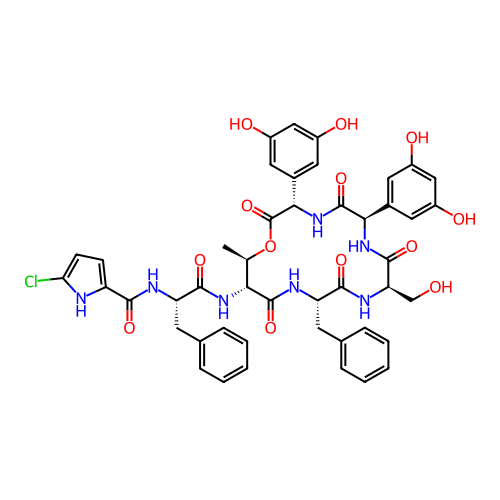 | SMILES | C[C@@H]1[C@H](C(=O)N[C@H](C(=O)N[C@@H](C(=O)N[C@@H](C(=O)N[C@H](C(=O)O1)C2=CC(=CC(=C2)O)O)C3=CC(=CC(=C3)O)O)CO)CC4=CC=CC=C4)NC(=O)[C@H](CC5=CC=CC=C5)NC(=O)C6=CC=C(N6)Cl |