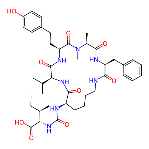 | SMILES | CC[C@@H](C)[C@@H](C(=O)O)NC(=O)N[C@@H]1CCCCNC(=O)[C@@H](NC(=O)[C@@H](N(C(=O)[C@@H](NC(=O)[C@@H](NC1=O)C(C)C)CCC2=CC=C(C=C2)O)C)C)CC3=CC=CC=C3 |