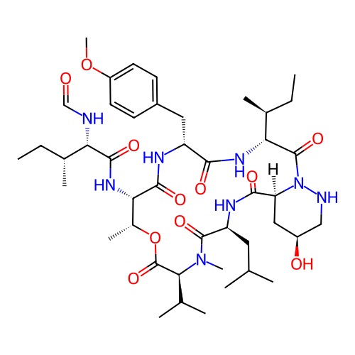 | InChI | InChI=1S/C44H70N8O11/c1-12-25(7)34(45-22-53)40(57)50-36-27(9)63-44(61)37(24(5)6)51(10)42(59)32(18-23(3)4)48-39(56)33-20-29(54)21-46-52(33)43(60)35(26(8)13-2)49-38(55)31(47-41(36)58)19-28-14-16-30(62-11)17-15-28/h14-17,22-27,29,31-37,46,54H,12-13,18-21H2,1-11H3,(H,45,53)(H,47,58)(H,48,56)(H,49,55)(H,50,57)/t25-,26+,27-,29+,31-,32+,33+,34+,35-,36+,37+/m1/s1 |