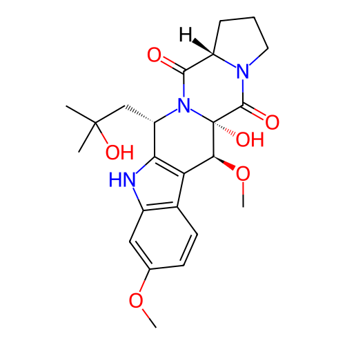 | InChI | InChI=1S/C23H29N3O6/c1-22(2,29)11-16-18-17(13-8-7-12(31-3)10-14(13)24-18)19(32-4)23(30)21(28)25-9-5-6-15(25)20(27)26(16)23/h7-8,10,15-16,19,24,29-30H,5-6,9,11H2,1-4H3/t15-,16-,19-,23-/m0/s1 |
