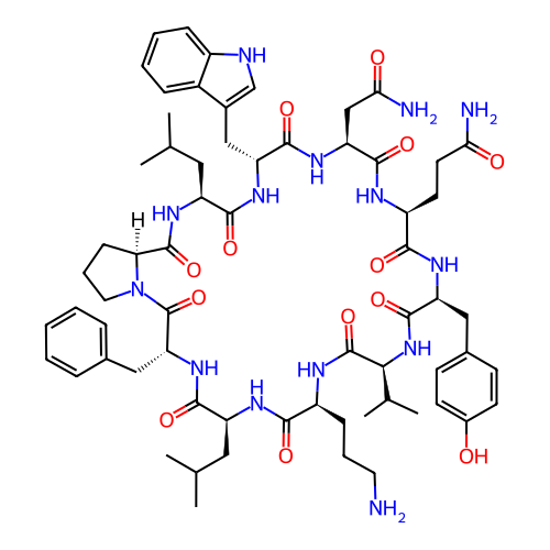 | SMILES | CC(C)C[C@H]1C(=O)N[C@@H](C(=O)N[C@H](C(=O)N[C@H](C(=O)N[C@H](C(=O)N[C@H](C(=O)N[C@H](C(=O)N[C@H](C(=O)N[C@@H](C(=O)N2CCC[C@H]2C(=O)N1)CC3=CC=CC=C3)CC(C)C)CCCN)C(C)C)CC4=CC=C(C=C4)O)CCC(=O)N)CC(=O)N)CC5=CNC6=CC=CC=C65 |
