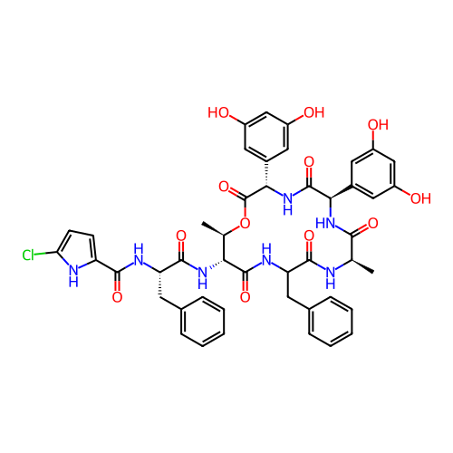 | SMILES | C[C@@H]1[C@H](C(=O)NC(C(=O)N[C@@H](C(=O)N[C@@H](C(=O)N[C@H](C(=O)O1)C2=CC(=CC(=C2)O)O)C3=CC(=CC(=C3)O)O)C)CC4=CC=CC=C4)NC(=O)[C@H](CC5=CC=CC=C5)NC(=O)C6=CC=C(N6)Cl |