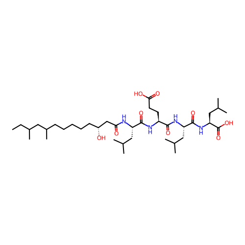 | SMILES | CCC(C)CC(C)CCCCC[C@H](CC(=O)N[C@@H](CC(C)C)C(=O)N[C@@H](CCC(=O)O)C(=O)N[C@@H](CC(C)C)C(=O)N[C@@H](CC(C)C)C(=O)O)O |