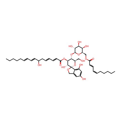 | SMILES | CCCCC/C=C/C=C/C(C/C=C/C=C/C(=O)O[C@H]1[C@@H]([C@H](O[C@]2([C@@H]1O)C3=C(C=C(C=C3CO2)O)O)CO)O[C@H]4[C@@H]([C@H]([C@H]([C@H](O4)COC(=O)/C=C/C=C\CCCCC)O)O)O)O |