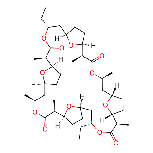 | InChI | InChI=1S/C42H68O12/c1-9-29-21-33-13-17-35(51-33)25(5)39(43)47-24(4)20-32-12-16-38(50-32)28(8)42(46)54-30(10-2)22-34-14-18-36(52-34)26(6)40(44)48-23(3)19-31-11-15-37(49-31)27(7)41(45)53-29/h23-38H,9-22H2,1-8H3/t23-,24-,25-,26-,27+,28+,29+,30+,31-,32-,33+,34+,35-,36-,37+,38+/m0/s1 |