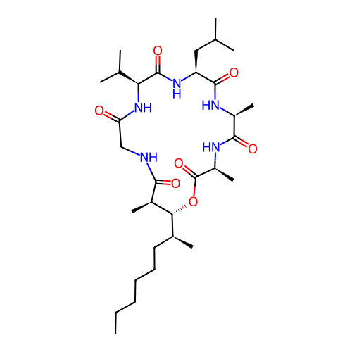 | SMILES | CCCCCC[C@H](C)[C@@H]1[C@H](C(=O)NCC(=O)N[C@H](C(=O)N[C@H](C(=O)N[C@H](C(=O)N[C@H](C(=O)O1)C)C)CC(C)C)C(C)C)C |