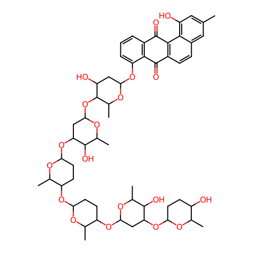 | SMILES | CC1C(CCC(O1)OC2CC(OC(C2O)C)OC3CCC(OC3C)OC4CCC(OC4C)OC5CC(OC(C5O)C)OC6C(OC(CC6O)OC7=CC=CC8=C7C(=O)C9=C(C8=O)C1=C(C=C(C=C1C=C9)C)O)C)O |