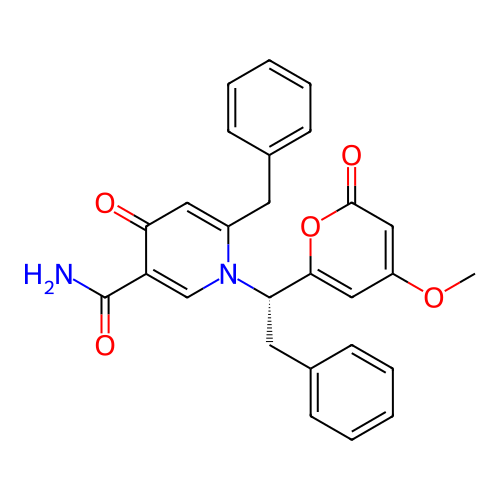 | SMILES | COC1=CC(=O)OC(=C1)[C@H](CC2=CC=CC=C2)N3C=C(C(=O)C=C3CC4=CC=CC=C4)C(=O)N |