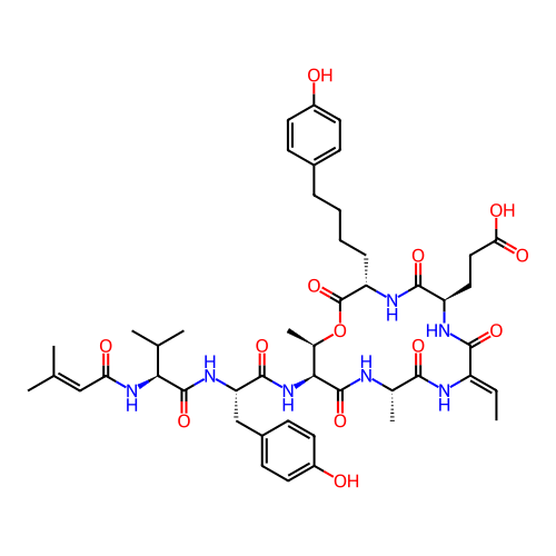 | SMILES | C/C=C\1/C(=O)N[C@@H](C(=O)N[C@H](C(=O)O[C@@H]([C@@H](C(=O)N[C@H](C(=O)N1)C)NC(=O)[C@H](CC2=CC=C(C=C2)O)NC(=O)[C@H](C(C)C)NC(=O)C=C(C)C)C)CCCCC3=CC=C(C=C3)O)CCC(=O)O |