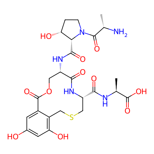 | SMILES | C[C@@H](C(=O)N1CC[C@H]([C@H]1C(=O)N[C@H]2COC(=O)C3=CC(=CC(=C3CSC[C@H](NC2=O)C(=O)N[C@@H](C)C(=O)O)O)O)O)N |