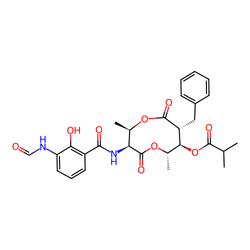 | SMILES | C[C@H]1[C@@H]([C@H](C(=O)O[C@@H]([C@@H](C(=O)O1)NC(=O)C2=C(C(=CC=C2)NC=O)O)C)CC3=CC=CC=C3)OC(=O)C(C)C |