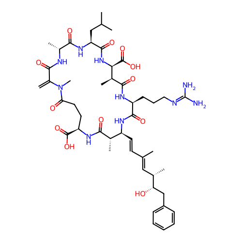 | SMILES | C[C@H]1[C@@H](NC(=O)[C@@H](NC(=O)[C@H]([C@@H](NC(=O)[C@@H](NC(=O)[C@H](NC(=O)C(=C)N(C(=O)CC[C@@H](NC1=O)C(=O)O)C)C)CC(C)C)C(=O)O)C)CCCN=C(N)N)/C=C/C(=C/[C@H](C)[C@H](CC2=CC=CC=C2)O)/C |