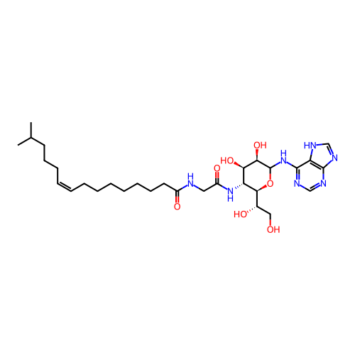 | SMILES | CC(C)CCC/C=C\CCCCCCCC(=O)NCC(=O)N[C@@H]1[C@H]([C@H](C(O[C@H]1[C@H](CO)O)NC2=NC=NC3=C2NC=N3)O)O |