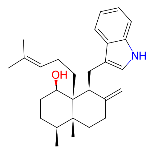 | InChI | InChI=1S/C28H39NO/c1-19(2)9-8-15-28-24(17-22-18-29-25-11-7-6-10-23(22)25)20(3)14-16-27(28,5)21(4)12-13-26(28)30/h6-7,9-11,18,21,24,26,29-30H,3,8,12-17H2,1-2,4-5H3/t21-,24-,26+,27+,28-/m0/s1 |