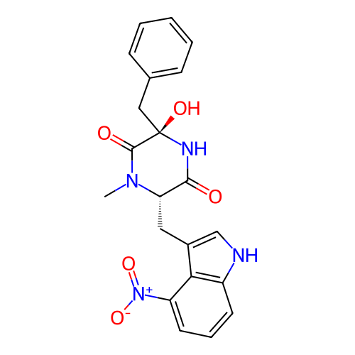 | InChI | InChI=1S/C21H20N4O5/c1-24-17(10-14-12-22-15-8-5-9-16(18(14)15)25(29)30)19(26)23-21(28,20(24)27)11-13-6-3-2-4-7-13/h2-9,12,17,22,28H,10-11H2,1H3,(H,23,26)/t17-,21+/m0/s1 |