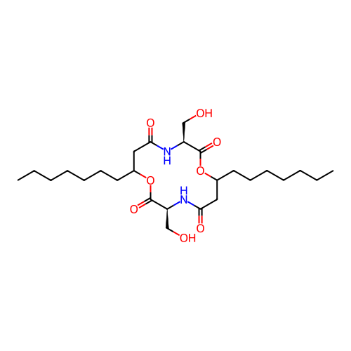 | SMILES | CCCCCCCC1CC(=O)N[C@H](C(=O)OC(CC(=O)N[C@H](C(=O)O1)CO)CCCCCCC)CO |