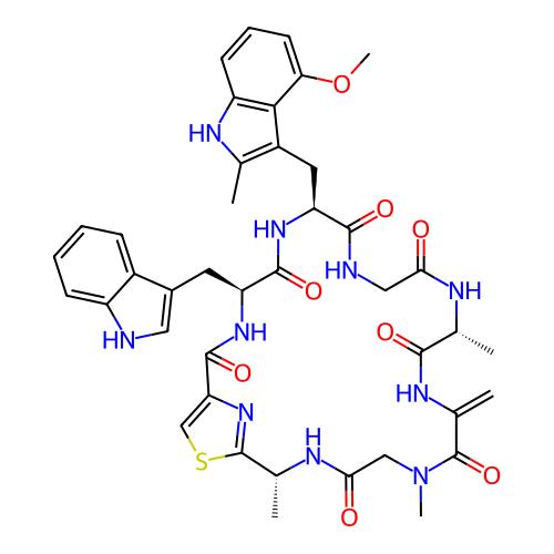 | SMILES | C[C@@H]1C(=O)NC(=C)C(=O)N(CC(=O)N[C@@H](C2=NC(=CS2)C(=O)N[C@H](C(=O)N[C@H](C(=O)NCC(=O)N1)CC3=C(NC4=C3C(=CC=C4)OC)C)CC5=CNC6=CC=CC=C65)C)C |