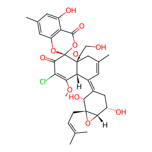 | InChI | InChI=1S/C33H35ClO11/c1-14(2)6-7-32-27(39)18(11-20(37)29(32)44-32)17-8-16(4)12-31(22(38)13-35)24(17)26(42-5)25(34)28(40)33(31)43-21-10-15(3)9-19(36)23(21)30(41)45-33/h6,8-10,20,24,27,29,35-37,39H,7,11-13H2,1-5H3/b18-17-/t20-,24+,27+,29-,31-,32+,33-/m0/s1 |