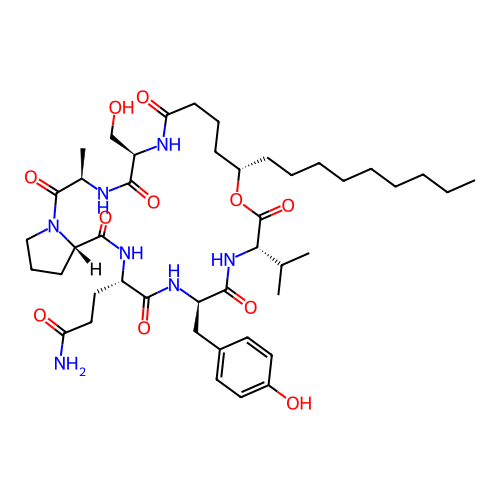 | SMILES | CCCCCCCCC[C@H]1CCCC(=O)N[C@@H](C(=O)N[C@@H](C(=O)N2CCC[C@H]2C(=O)N[C@H](C(=O)N[C@@H](C(=O)N[C@H](C(=O)O1)C(C)C)CC3=CC=C(C=C3)O)CCC(=O)N)C)CO |