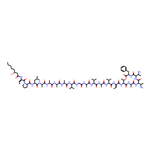 | SMILES | CCCCCC(O)CC(=O)N\C(=C\C)C(=O)N1CCCC1C(=O)NC(CC(C)C)C(=O)NC(C)C(=O)NC(C)C(=O)NC(C)C(=O)NC(C)C(=O)NC(C(C)C)C(=O)NCC(=O)NC(C)C(=O)NC(C(C)C)C(=O)NC(C)C(=O)NC(C(C)C)C(=O)N\C(=C/C)C(=O)NC1C(C)OC(=O)C(CC2=CC=CC=C2)NC(=O)C(NC(=O)C(NC(=O)C(C)NC1=O)C(C)N)C(C)N |