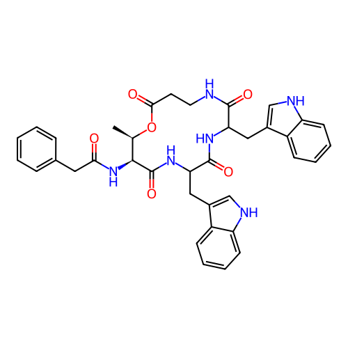 | SMILES | C[C@@H]1[C@@H](C(=O)NC(C(=O)NC(C(=O)NCCC(=O)O1)CC2=CNC3=CC=CC=C32)CC4=CNC5=CC=CC=C54)NC(=O)CC6=CC=CC=C6 |