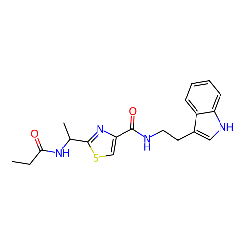 | SMILES | CCC(=O)NC(C)C1=NC(=CS1)C(=O)NCCC2=CNC3=CC=CC=C32 |