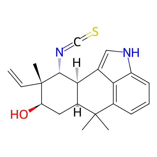 | SMILES | C[C@@]1([C@@H](C[C@H]2[C@@H]([C@H]1N=C=S)C3=CNC4=CC=CC(=C43)C2(C)C)O)C=C |