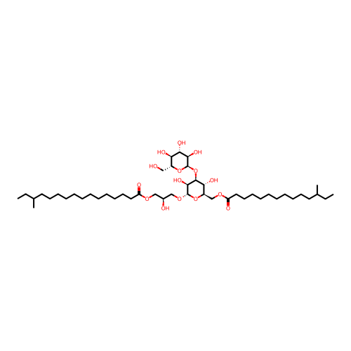 | InChI | InChI=1S/C47H88O15/c1-5-33(3)25-21-17-13-9-7-8-10-15-19-23-27-38(50)57-30-35(49)31-59-46-44(56)45(62-47-43(55)42(54)40(52)36(29-48)60-47)41(53)37(61-46)32-58-39(51)28-24-20-16-12-11-14-18-22-26-34(4)6-2/h33-37,40-49,52-56H,5-32H2,1-4H3/t33?,34?,35-,36+,37+,40+,41+,42-,43+,44-,45-,46-,47+/m0/s1 |