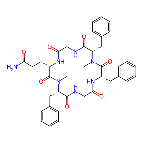 | SMILES | CN1[C@H](C(=O)NCC(=O)N[C@H](C(=O)N([C@H](C(=O)NCC(=O)N[C@H](C1=O)CCC(=O)N)CC2=CC=CC=C2)C)CC3=CC=CC=C3)CC4=CC=CC=C4 |