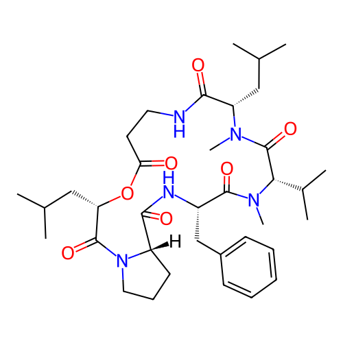 | SMILES | CC(C)C[C@H]1C(=O)NCCC(=O)O[C@H](C(=O)N2CCC[C@H]2C(=O)N[C@H](C(=O)N([C@H](C(=O)N1C)C(C)C)C)CC3=CC=CC=C3)CC(C)C |