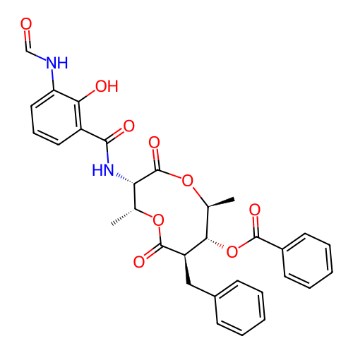 | SMILES | C[C@H]1[C@@H]([C@H](C(=O)O[C@@H]([C@@H](C(=O)O1)NC(=O)C2=C(C(=CC=C2)NC=O)O)C)CC3=CC=CC=C3)OC(=O)C4=CC=CC=C4 |