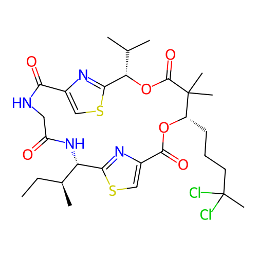 | SMILES | CC[C@H](C)[C@H]1C2=NC(=CS2)C(=O)O[C@H](C(C(=O)O[C@H](C3=NC(=CS3)C(=O)NCC(=O)N1)C(C)C)(C)C)CCCC(C)(Cl)Cl |